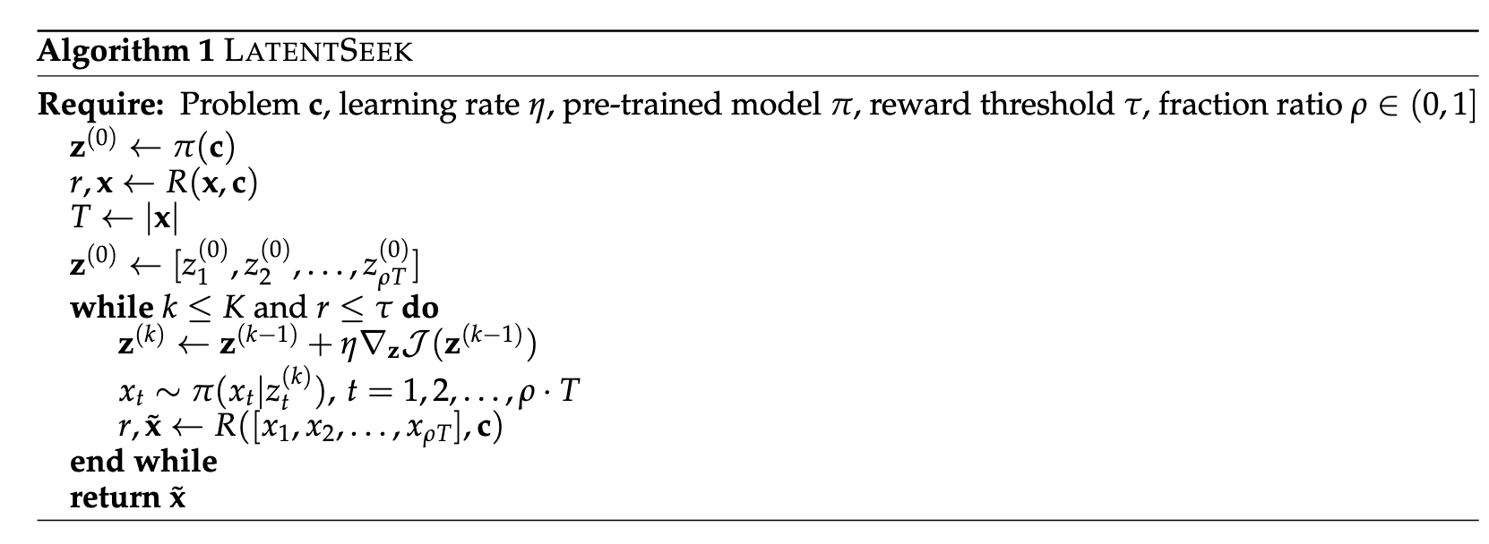 The LatentSeek algorithm is described in Algorithm 1. This algorithm iteratively refines the latent representations based on the rewards of generated reasoning paths, effectively performing a guided search through the reasoning space specific to the given problem instance. After each refinement step, the latent representations are decoded into tokens to calculate a reward signal. This signal is then employed to direct the search process in the subsequent iteration. Along with the reward signal, the final output \(\tilde{\mathbf{x}}\) is also explicitly provided. The process runs for a small number of iterations (typically 2-10), stopping early if the reward exceeds a threshold.
