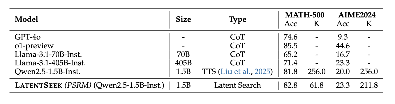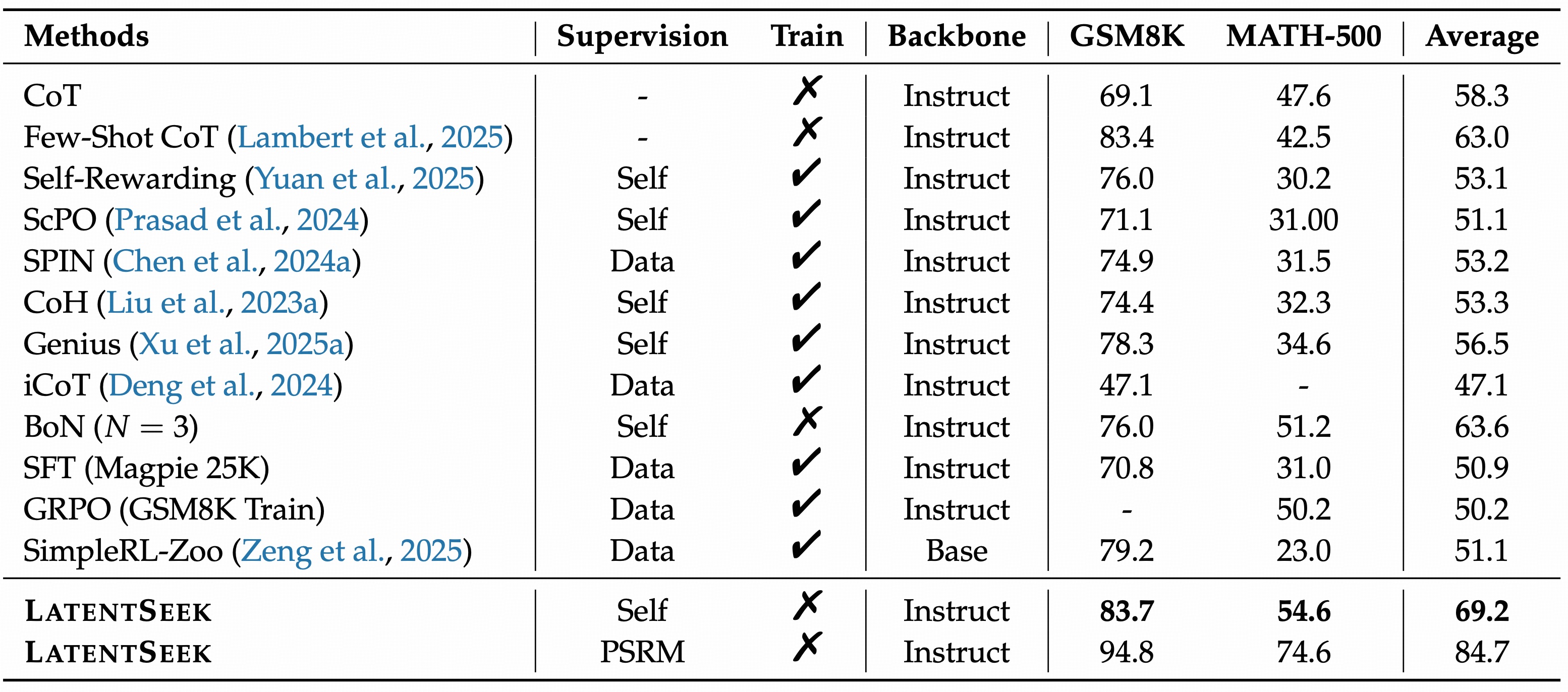 - Generalizable across backbones: LatentSeek demonstrates superior performance across multiple model families. Also, in terms of model scales, our method consistently outperforms all baseline models across diverse datasets and prompt types